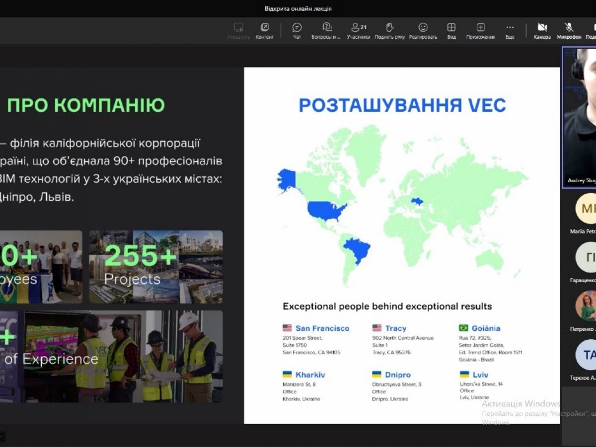 On April 15, 2024 at 5 p.m. within the framework of the international project "The BRIDGE", under the Erasmus+ program "Potential building in the field of higher education" and with the support of Assoc. Artem Sopilnyak, the VEC-UA company held an open lecture online in Microsoft Teams on the topic "Automation in VIM". The online lecture was attended by students of the first (bachelor's) level of higher education, specialty 192 "Construction and civil engineering" and teachers of PDABA.